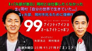 ナインティナインのオールナイトニッポン|矢部「もう一緒にやりたくなかった」岡村と15年のすれ違いと本音の告白【友情と再出発】 2025/6/28 岡村 隆史 スポンサーリンク ナインティナインのオールナイトニッポン|矢部「もう一緒にやりたくなかった」岡村と15年のすれ違いと本音の告白【友情と再出発】 「一緒にやりたくなかった」と語る矢部浩之、 「自分の世界しか見ていなかった」と孤独を明かす岡村隆史—— すれ違い続け …